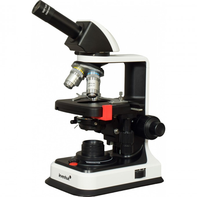 Микроскоп оснащен монокулярной насадкой с углом наклона 30° и возможностью полного вращения вокруг своей оси на 360°. Увеличение установленного широкопольного окуляра – 10х, поле зрения – 18 мм; возможна диоптрийная подстройка в пределах ±5 D – удобно для пользователей с особенностями зрения. В приборе используется ахроматическая оптика – 4 объектива с увеличением 4х, 10х, 40х и 100х в револьверном устройстве. Такую конструкцию удобно использовать для одиночных и групповых наблюдений, в индивидуальной и коллективной работе.